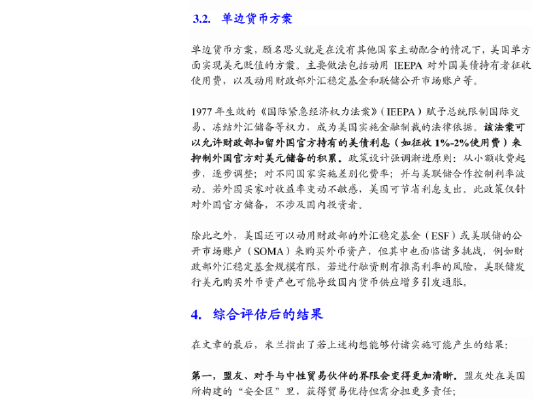 2)美国也可以单方面实施美元贬值的方案。主要做法包括动用IEEPA 对外国美债持有者征收使用费,以及动用财政部外汇稳定基金和联储公开市场账户等;但可能会造成利率上升和通货膨胀。
