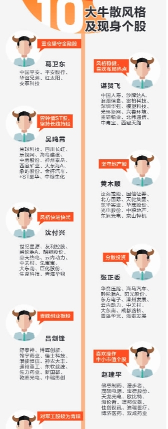 总体上看,各牛散财富惊人,如葛卫东二季度末的持股市值高达百亿元。从投资手法上看,则是八仙过海,各显神通。单从行业属性来看,有的押注金融股,有的坚守地产股,有的青睐软件股,有的潜伏军工股。从个股的风格来看,有的钟情ST股,有的喜欢买创业板股。从持股时间来看,有的快进快出、追逐热点,有的长期持股,甚至蛰伏数年。