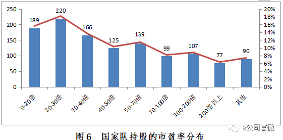 (3)从估值水平来看,如图6所示,国家队青睐低市盈率的上市公司(市盈率低于30倍)。国家队所持股票中,市盈率在0-20倍、20-30倍之间的上市公司家数最多,分别为189家和220家,占比分别为15.59%、18.15%,合计占比33.74%。