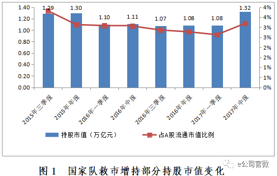自2015年7月中央吹响救市号角之后,国家队响应号召入场救市,截至2015年三季度末,国家队持股个数达到1404只,占全部A股个数的50.50%,覆盖了A股一半的公司。剔除国家队救市前已持有的存量市值后,新增市值为1.28万亿元(按定期报告期末收盘价计算,下同),占A股流通市值比例为3.82%。