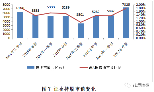 截至2017年二季度末,如图7所示,证金持股救市以来增持市值达到7325亿元,处于历史高位,占A股流通市值比例为1.77%,处于历史第二高位,仅次于2015年三季度救市时的水平(2015年三季度末持股市值占A股流通市值比例为1.83%)。