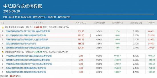值得注意的是,这是佛山系游资第二次介入中弘股份。数据显示,佛山系首次介入中弘股份在8月28日,旗下的核心营业部光大证券佛山绿景路以522万元的买入额高居中弘股份当日龙虎榜买二的位置,助力中弘股份成功封死涨停板。次日,中弘股份开盘跌停,光大证券佛山绿景路净卖出468.51万元,亏损10%割肉离场。
