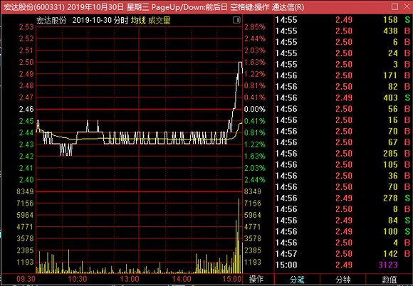 以宏达股份(600331.SH)为例,从2019年10月30日的分时图上可以看出,尾盘时分,该股有明显资金流入迹象,股价也随之快速上涨。