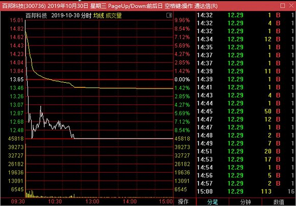 例如百邦科技(300736.SZ)。2019年10月28日至29日,百邦科技两连板,10月30日,百邦科技以近乎涨停的价格开盘后,股价快速杀跌,至9:40仅仅10分钟内便被砸至跌停,10:48后最终封死跌停板直至收盘。次日,该股继续大幅低开后以跌停报收,短线接盘者参与者可谓血本无归。
