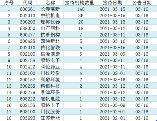 截止最新发稿,上市公司共披露18次调研记录。其中长春高新、中航机电、理邦仪器、山石网科等居前。
