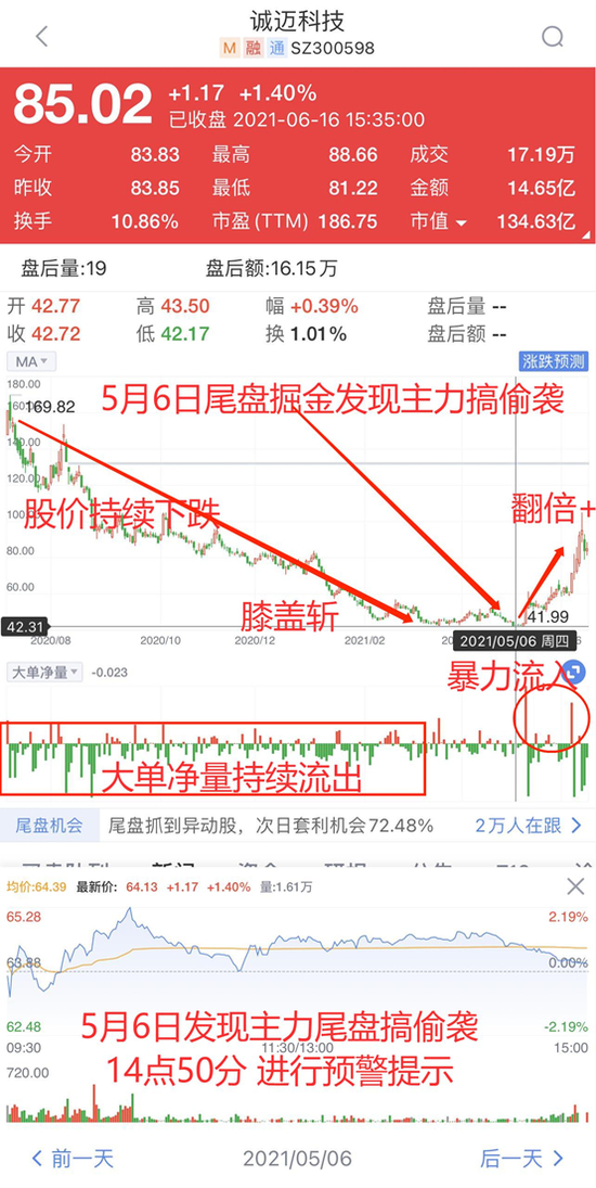 5月6日,尾盘掘金发现主力在诚迈科技的尾盘搞偷袭,并在当天的14点50分进行了预警提示。同时,当天新浪财经Level-2的大单净量流出幅度也出现了大幅减少,这意味着有主力资金在行动。5月12号,大单净量就出现了天量的流入,这意味着主力正在急不可耐的收集筹码。