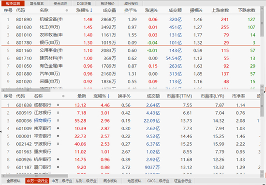 只不过今天轮到了银行板块,上午收盘大涨1.3%。十连跌之后,成都银行大涨4.46%,江苏银行、招商银行、南京银行、平安银行、宁波银行纷纷跟涨。