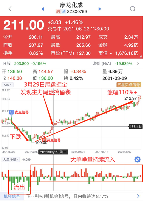 3月29日,尾盘掘金发现了主力潜伏康龙化成的迹象,并在当天14点50分进行了异动提醒。新浪财经Level-2大单净量的数据显示,其实从3月上旬开始至今,大单净量就呈现出了持续大幅流入的状态,表明主力资金正在持续加码介入,这也推动了股价的不断上涨,康龙化成的股价从100元左右涨到了210元左右,涨幅超过了110%。