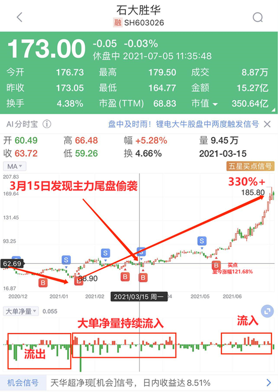 3月15日,尾盘掘金发现主力在石大胜华的尾盘搞偷袭,并在当天14点50分进行了预警提示。并且在此之后,大单净量资金开始了持续介入的状态,这也推动了股价的不断上涨。石大胜华的股价从40元左右涨破了173元,涨幅超过330%。