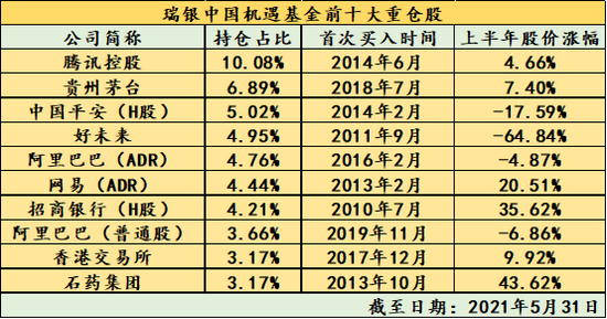 比如,施斌管理规模最大的中国机遇基金,截至2021年5月31日,前十大重仓股分别为腾讯控股、贵州茅台、中国平安、好未来、阿里巴巴、网易、招商银行、香港交易所和石药集团(如下图)。
