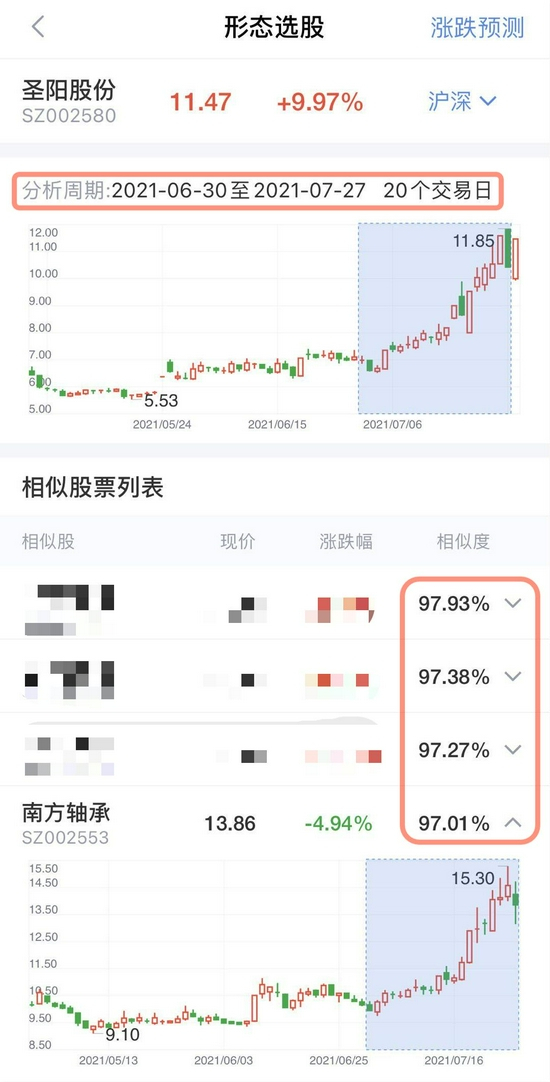 再选取圣阳股份近一段时间的走势,也就是6月30日-7月27日的一段K线走势,利用新浪财经-形态识金寻找跟他近期强劲走势相似的前20只个股。选取前四只个股发现,相似度均超97%!相似度排在第四名的神秘个股南方轴承近期也表现强势,近10个交易日大涨超过36%,后市走向更值得期待!