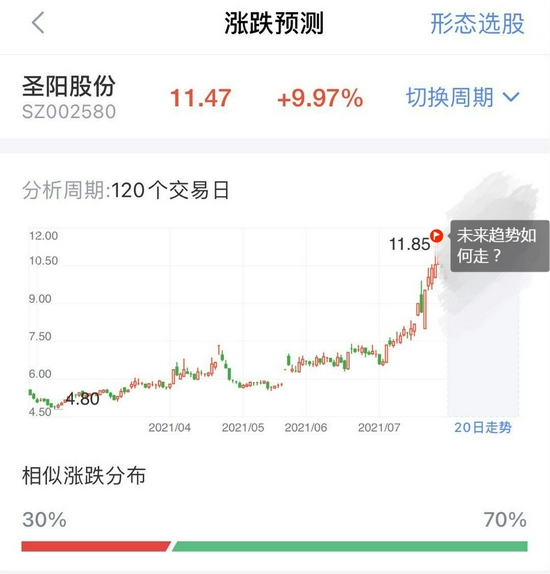 以今日涨停的圣阳股份为例,利用新浪财经-形态识金对其现有120天的形态走势,分析了该股未来20天的走势预测,强劲走势还能持续多久?打开新浪财经-形态识金速来解锁>>未来走势也就不再成迷!
