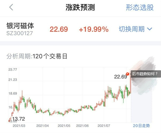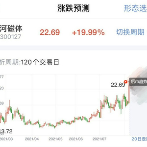 就以今日大涨的银河磁体为例,利用新浪财经-形态识金对其现有120天的形态走势,分析了该股未来20天的走势预测,强劲走势还能持续多久?打开新浪财经-形态识金速来解锁>>未来走势也就不再成迷!