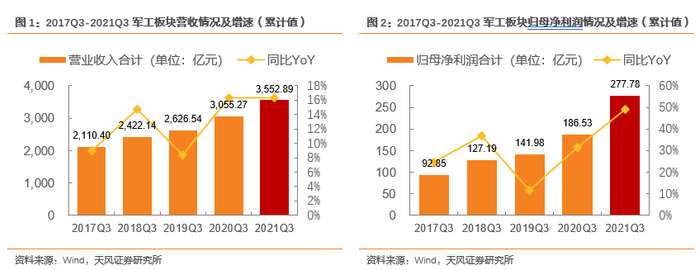 军工板块前三季度实现营业收入3552.89亿元,同比+16.29%;实现归母净利润277.78亿元,同比+48.92%。单季度看,板块21Q3实现营业收入1213.28亿元,同比+7.51%,环比-11.02%;实现归母净利润91.24亿元,同比+25.69%,环比-21.81%。军工板块各细分领域充分受益于“十四五”跨越式武器装备需求增长及产业链景气度传导,2021年三季报维持高增长态势。