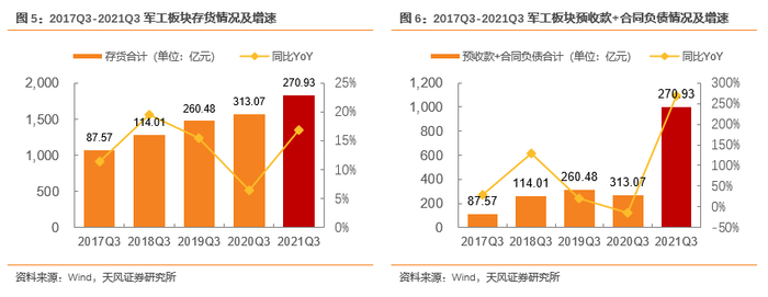 资产负债表端,剔除民船需求大幅提升影响下的船舶类标的,预收款+合同负债达1000.82亿元,同比+269.40%;军工板块三季度末存货总额达1832.74亿元,同比+16.79%。