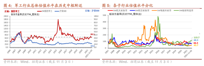 1)、年内具有超额收益,行业估值回调充分。年初至今SW国防军工指数上涨2.63%,跑赢沪深300指数10.12个百分点。在28个申万一级行业分类中,国防军工板块2021年涨幅排名第12。目前行业动态估值66倍,处于历史中枢附近,与历史高点来看仍有明显空间,考虑到十四五期间行业业绩持续兑现,目前行业估值仍处于合理水平,而随着估值切换到2022年,行业估值水平再次回落,具备再次上涨的估值空间。