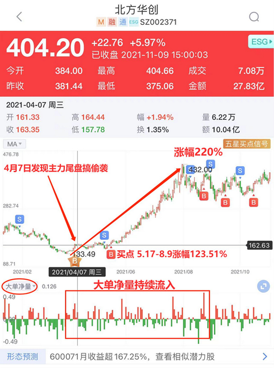 5月17日和8月9日,B/S点也发出了提示信号,北方华创从163.7元涨至373元,区间涨幅为123.51%。