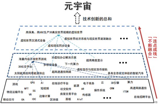 中信证券认为,元宇宙的终极形态将指向人类的数字化生存,对社会产生深远的影响,但需要较长时间。过去20年,互联网改变人类生活,将人和人的交流数字化;未来20年乃至更久,元宇宙将把人与社会的关系数字化。元宇宙将呈现渐进式发展,单点技术创新不断出现和融合、“连点成线”,从产业各方面向元宇宙靠近。