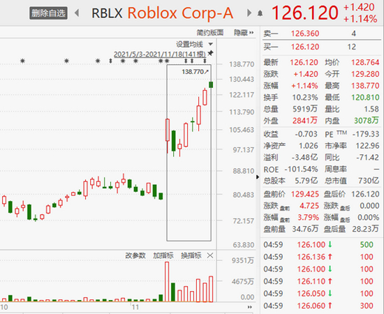 11月9日,元宇宙第一股Roblox公布了2021财年Q3业绩报告,Q3营收为5.093亿美元,同比增长102%。平均日活跃用户(DAU)为4730万,同比增长31%。在线小时数112亿;三季度预定6.378亿美元,分析师预期6.242亿美元。消息公布后,Roblox当晚暴涨42.23%,截至11月19日的累计涨幅高达63.79%,总市值为730亿美元。