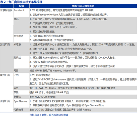 申万宏源认为,元宇宙的核心特征是社交、内容丰富性、沉浸体验和经济系统。移动互联网流量红利接近尾声,在用户数增长乏力的阶段,追求更高时长以及更高的ARPU成为重点突破指标,元宇宙即为科技公司当前重点布局的方向。梳理各厂商在元宇宙上的布局,主要集中在3个方向:1)VR/AR技术和产品开发(对应沉浸感);2)UGC技术和产品的打造(对应经济系统和内容丰富性);3)社交元宇宙构建(对应社交)。