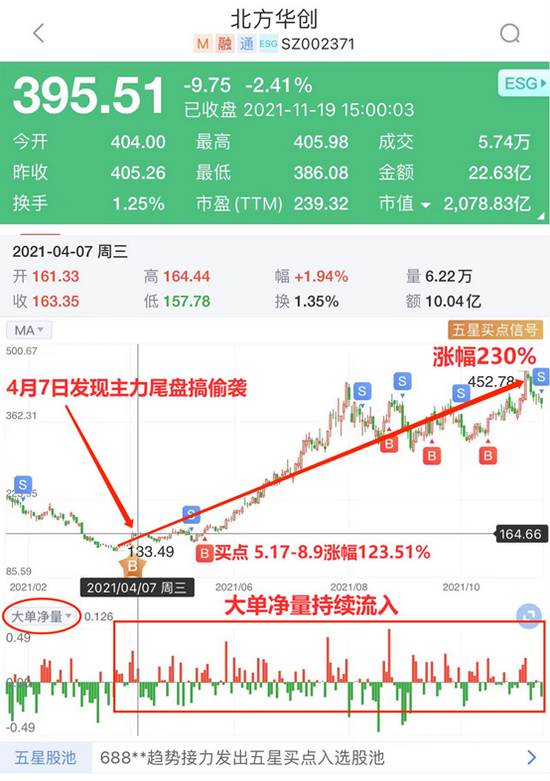 5月17日和8月9日,B/S点也发出了提示信号,北方华创从163.7元涨至373元,区间涨幅为123.51%。