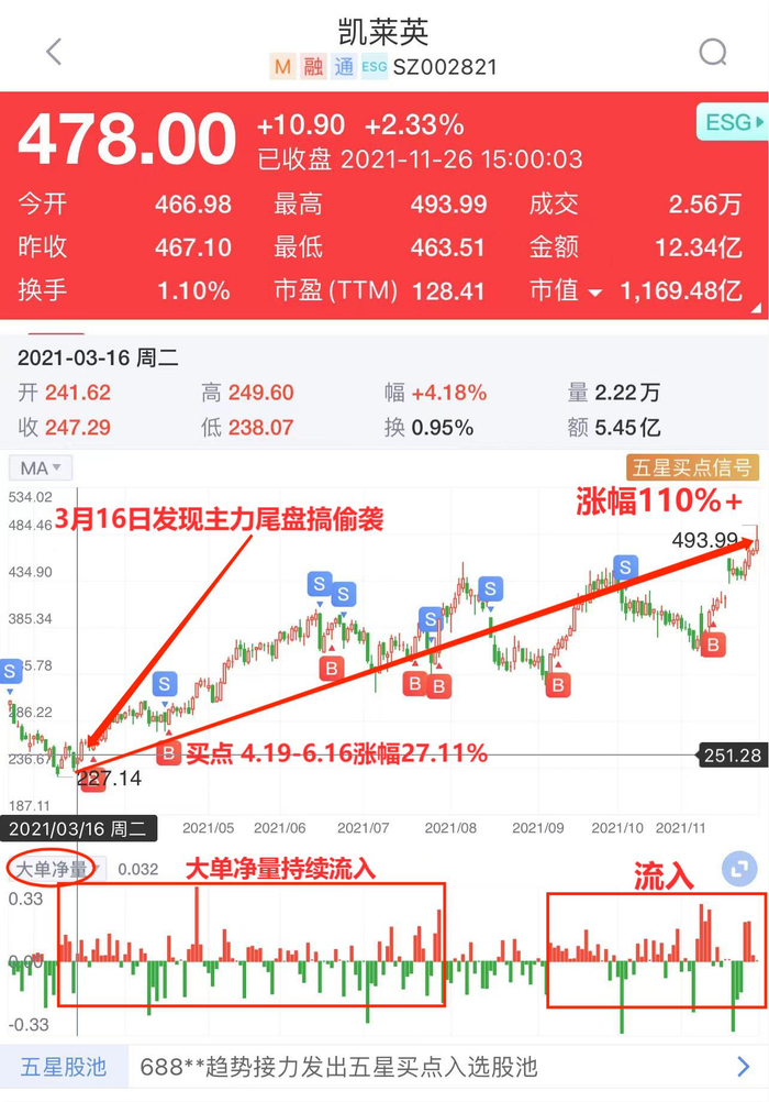 3月16日,尾盘掘金发现主力在凯莱英的尾盘搞偷袭,并在当天14点50分进行了预警提示。新浪财经Level-2大单净量的数据显示,其实3月中旬开始,凯莱英的大单净量资金就开始了持续介入的状态,这也推动了股价的不断上涨,凯莱英的股价从3月初的228元左右最高涨到了494左右,涨幅110%+。