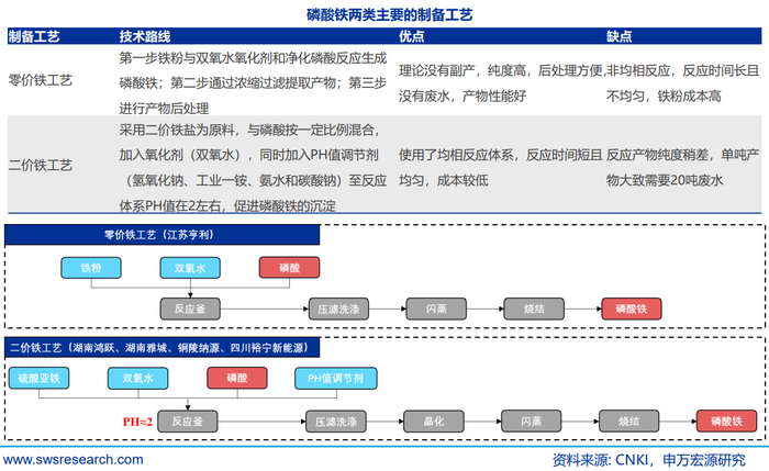 需要注意的是,磷化工企业制备磷酸铁拥有最强成本优势,成为产业链拓展的重要方向。磷酸铁制备工艺本质是净化磷酸和铁源的反应,根据铁源的来源可以大致分为两类工艺路线,零价铁工艺和二价铁工艺,净化磷酸提供磷源,工业一铵则主要作为PH值调节剂。根据申万宏源测算,零价铁工艺原料成本显著高于二价铁工艺。通过对比三类不同磷酸铁企业的二价铁工艺成本:原料外购企业的成本约为9989元/吨,其中磷源成本占总成本53%,铁源占比仅为6%;铁源自备企业在二价铁成本为0的情况下预计成本为9389元/吨,磷源自备企业以自产净化磷酸成本为3500元/吨测算成本约为7643元/吨。因此拥有磷资源的磷化工企业制备磷酸铁成本最低。
