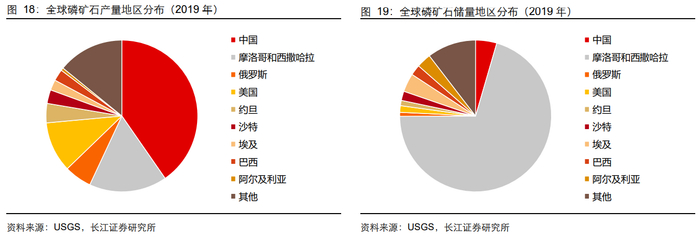 从全球产量分布来看,2019年中国磷矿石占比为40.4%,海外主要为非洲的摩洛哥和西撒哈拉。从全球磷矿石储量来看,摩洛哥和西撒哈拉占比为70.4%,中国占比在4.5%,中国磷矿的采储比处于全球较低水平。