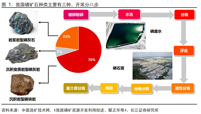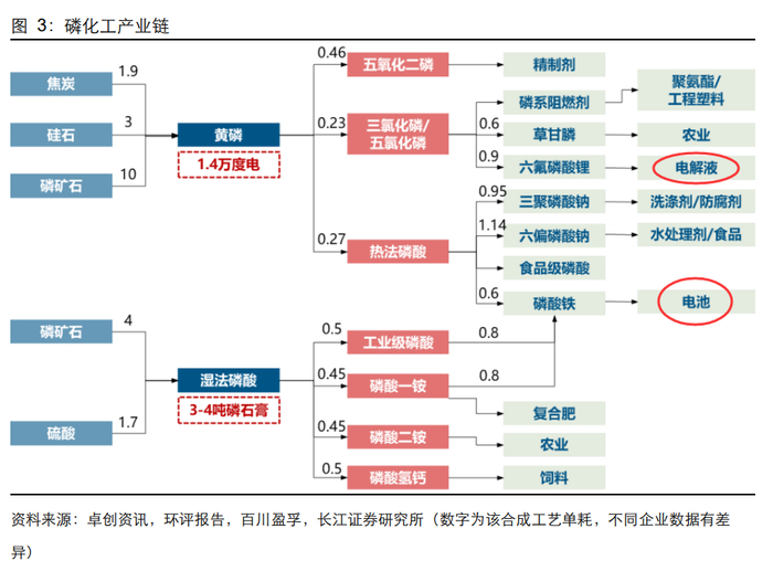 磷化工产业链上游核心原材料为磷矿石,磷矿石多产于沉积岩,也有产于变质岩和火成岩,除个别情况外,矿物中的磷总是以正磷酸盐形态存在,磷的主要矿物为磷灰石。磷是重要的化工原料,也是农作物生长的必要元素,工业用磷必须大量从磷矿中提取,用于制造黄磷、赤磷、磷酸、磷肥、磷酸盐等。