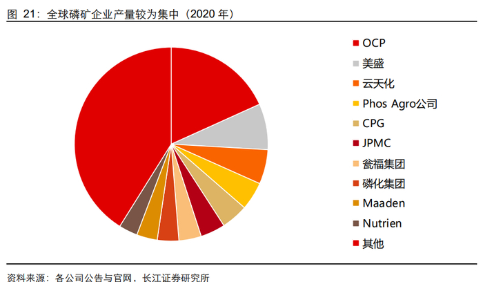从行业集中度来看,2020年全球前十大磷矿企业产量占比约为60%,海外主要生产企业为摩洛哥磷酸盐公司、美盛公司、约旦磷酸盐矿业公司等企业,海外企业仍有一定磷矿扩产计划,但是周期较长,预计未来海外磷矿石扩产将有序释放。