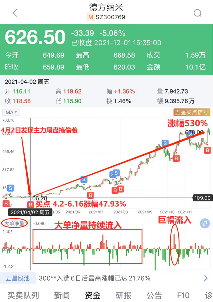 4月2日,尾盘掘金发现了主力在德方纳米的尾盘搞偷袭,并在当天14点50分进行了异动提醒。4月中旬,主力资金开始大幅流入,同时也推动了股价的不断上涨,德方纳米的股价从107元左右涨到了678元左右,最大涨幅超过530%。