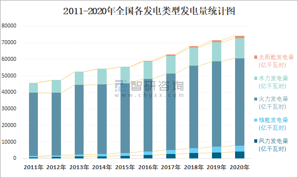 理解电力市场化改革,就需要先了解我国的能源结构。根据国家统计局数据统计可知:2011-2020年全国发电量逐年递增,从发电量类型来看,火力发电量占比最大(2020年占比为71.19%),且近10年有所波动,总体呈现上升趋势。