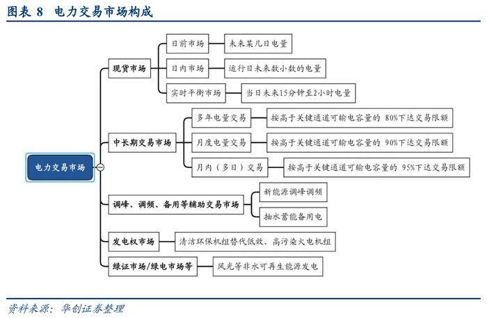 电力市场体系:我国总体电量总体包括保障性电量及竞争电量两部分,电力市场主要交易竞争性电量。经过不断的发展,我国目前形成了以中长期交易和现货交易为主,并辅以开展调频、调峰、备用等辅助服务交易和发电权交易、可再生能源电力绿色证书交易等其他相关交易的电力市场交易系统。