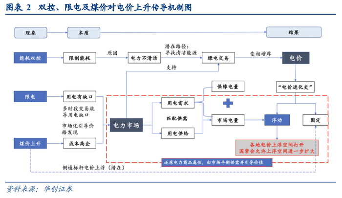 其次,还必须要了解双控、限电以及煤价对电价上升的传导机制。华创证券指出,“双控政策”本质是碳中和承诺下的能耗限制,“限电”本质是煤价高企导致的用电缺口叠加局部电力疏导不畅;“煤价”上升主要受产能等一系列内外供需问题的影响。这一系列市场异象导致我国电力市场的供需失衡频发,进而通过电力市场这一“枢纽”共同推动了电价上浮空间的打开。自7月份起,不断有省份允许电价上浮;10月8日,国常会进一步将市场交易电价上下浮动范围由分别不超过10%、15%,调整为原则上均不超过20%。10月11日,发改委发布《关于进一步深化燃煤发电上网电价市场化改革的通知》,要求有序放开全部燃煤发电电量上网电价,电力市场化进程进一步加快。