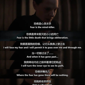 “恐惧是心灵的杀手,恐惧是带来毁灭的小小的死亡,我要直面我的恐惧,让它从我身上穿过去,当一切都过去了…...我将转动内在之眼看清它的轨迹,恐惧所剩无几,而我将依然存在。”——杰西卡