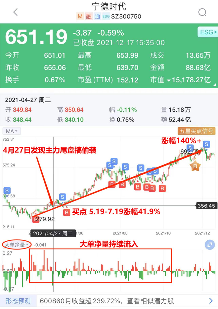 其实从3月下旬开始,大单净量资金就开始了持续流入的状态,这也推动了股价的稳步上涨,宁德时代的股价从今年最低的280元涨到了692元左右,涨幅超过了140%。