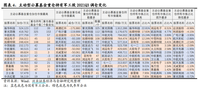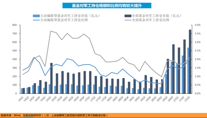 对于军工行业的高景气,机构已经用真金白银做出了选择。从数据上来看就是,基金对军工行业持仓规模和比例均有明显提升;主动持仓占全部持仓的比例大幅提升,2020Q2约43%,2021Q3约72%,为2014Q4以来的最高值。