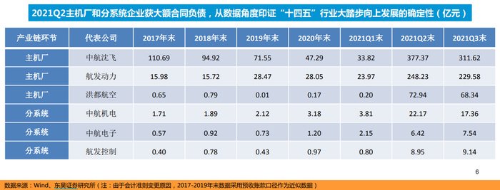 因此,在当前的情况下,军工板块的高景气共识已经形成,十四五高增长的确定性较高。不同于2021年上半年,目前市场对于军工行业十四五期间的高景气已形成高度共识。尤其是进入今年8月份以后,随着2021年中报披露,以中航沈飞、航发动力和洪都航空等为代表的主机厂披露大额合同负债,从直观数据角度印证了十四五行业大踏步向上发展的确定性。结合上市公司合同负债结构情况,东吴证券认为,十四五期间军工行业上市公司有望再获大额合同负债,行业在十四五期间有望保持高增长的确定性较高。