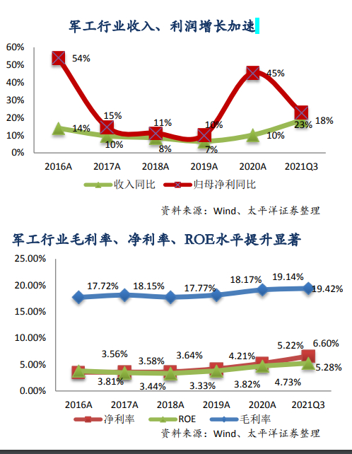 我国国防支出增长持续性强,装备支出占比提升。我国2021年国防支出预算13795.44亿元(其中:中央本级安排13553.43亿元),同比上年执行数增长6.8%。我国国防支出主要是用在加大武器装备建设投入,淘汰更新部分落后装备,升级改造部分老旧装备,研发采购航空母舰、作战飞机、导弹、主战坦克等新式武器装备,稳步提高武器装备现代化水平,2017年装备费用占比已达到41.1%,增长趋势明显。在目前较为特殊的背景下,太平洋证券估计近几年装备费用支出增速或将达到15%,带动军工行业整体业绩增长。