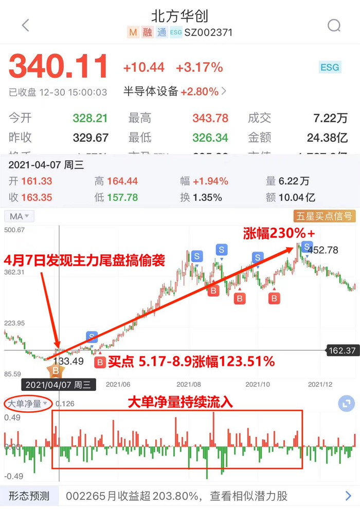 5月17日和8月9日,B/S点也发出了提示信号,北方华创从163.7元涨至373元,区间涨幅为123.51%。