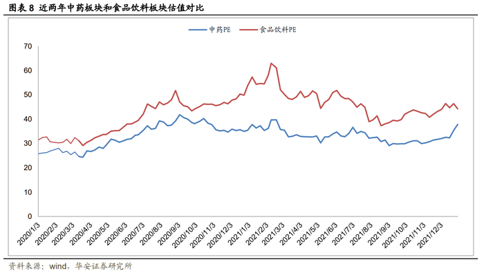 从2021年的年涨跌幅数据来看,申万中药板块全年上涨28.84%,为生物医药各板块中唯一正收益板块,估值PE也得到修复。但从几个维度来看中药板块还不算被高估,一方面是未来的预期上中药部分公司的预期估值并不高且大多PEG小于1;另外一方面横向对比食品饮料板块,一直还有所差距。