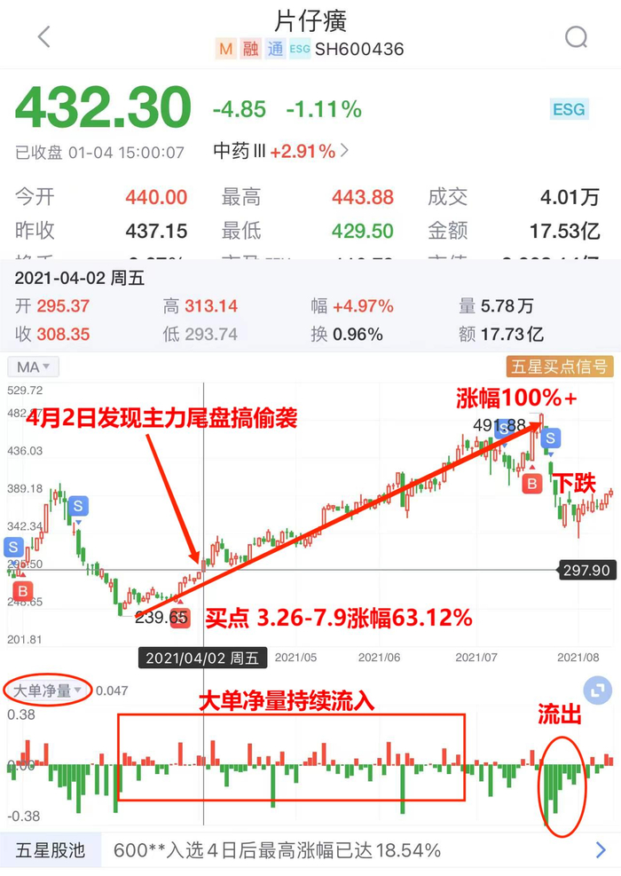3月26日和7月9日,B/S点也发出了提示信号,片仔癀从264.86元涨至432.05,区间涨幅为63.12%。