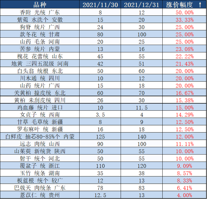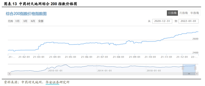 中药材天地网数据显示,截止2021年12月30日,中药材综合200指数报收2718.55点,点位与11月30日2686.56点相比,指数上涨1.19%。本月综合200指数持续上涨趋势,各地降温降雪,加之临近年关,各大市场交易略缓,但12月整体价格指数趋势属于缓慢上扬。2021年持续上涨趋势,全年上涨10.84%。