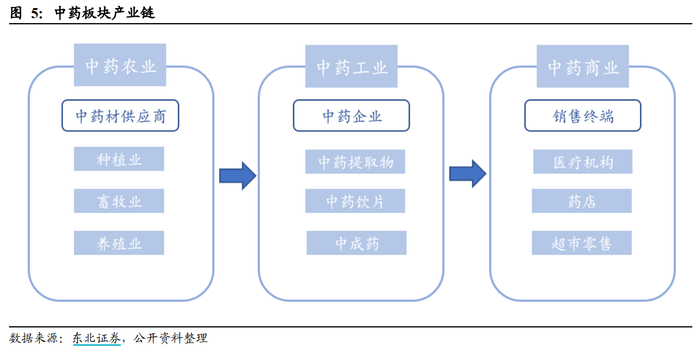 中药产业链主要分为中药农业、中药工业和中药商业三个部分。1)中药农业:主要包括育苗、育种业和养殖业为主的药材供应商,负责中药原材料的生产;2)中药工业:主要包括与中药产品生产相关的各行业,集中了部分大中型企业,技术水平相对较高,产品主要包括中药饮片和中成药;3)中药商业:中药商业是产业链的下游环节,是中药产业链的拓展和延伸,主要包括医疗机构、药店等销售终端。