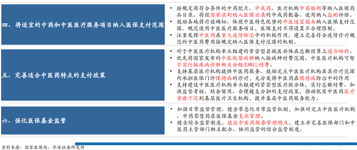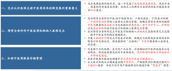 我们先来看政策的催化。2021年12月30日,国家医疗保障局、国家中医药管理局发布《国家医疗保障局国家中医药管理局关于医保支持中医药传承创新发展的指导意见》,在政策端推进多项措施支持和推动中医药行业发展。除了在医保支持的认知、医疗机构纳入医保的调整、中医药服务价格管理等方面的扶持政策,《意见》在医保支付范围、支付政策、基金监管等方面也推出了相应的政策。其中最重要的一条是,将中药纳入医保支付范围,这意味着中药的用量会得到增长。