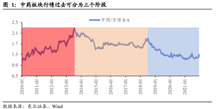 从超额收益角度来看,中药板块过去10年大致可分为3个阶段。1)跑赢大盘期间(2010年-2014年):中药板块相对大盘有明显的超额收益,主要原因在于中药行业受益于当时医保扩容期间的红利;2)震荡期间(2015年-2018年):中药板块超额收益已经不再显著,整体走势偏震荡,主要原因在于当时进行的医保改革使得中药板块之前所享受的政策红利开始有所消退;3)落后大盘(2018年至今):2018年后药监部门对中药进行了更加严格的管制,新药批准的速度也大幅下降,中药板块的营业收入和盈利大幅下滑,整体表现明显落后于大盘。