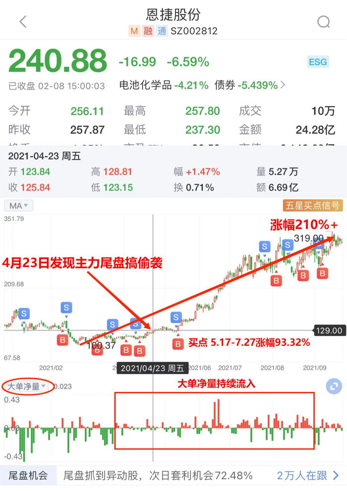 4月23日,尾盘掘金发现了主力潜伏恩捷股份的迹象,并在当天14点50分进行了异动提醒。同时,当天新浪财经Level-2的大单净量也由流出变为了流入,这意味着有主力资金在行动。