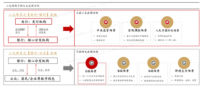 基于M0定位、二元运行体系,华西证券将 DCEP 的C端小额零售高频应用场景进行拓展至七大应用方向。