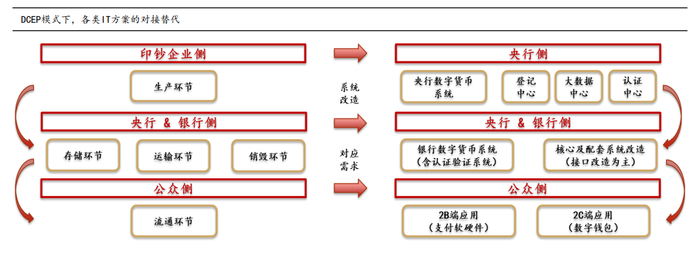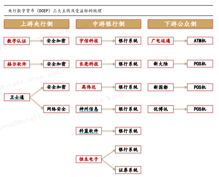 变革二:夯实货币流通根基,重塑软硬件技术设施。完善的货币基础设施是DCEP生态铺开的基础,POS和ATM将是公众侧确定性改造领域,同时数字货币硬件钱包也值得跟踪。