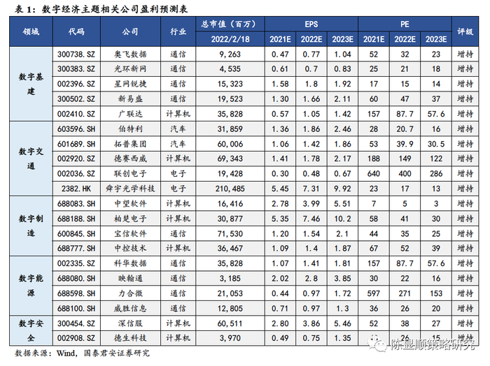 国泰君安认为,“东数西算”工程正式全面启动,全国一体化大数据中心体系完成总体布局设计。加快推动算力建设,将有效激发数据要素创新活力,加速数字产业化和产业数字化进程,催生新技术、新产业、新业态、新模式,支撑经济高质量发展。截止2020年我国数据中心机架规模达到500万架,预计十四五末期达到1800万架,近五年年均增速逾30%,或将新增1.95万亿投资。看好五大投资方向:1、数字基建:数字经济成为稳增长的重要引擎;2、数字交通:车路基础设施走向全面智能化;3、数字制造:实现制造业的系统智能化和软件自主化;4、数字能源:数字技术赋能新型电力系统构建;5、数字安全:发展数字经济的保障性工程。